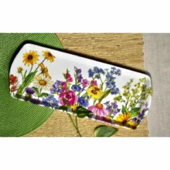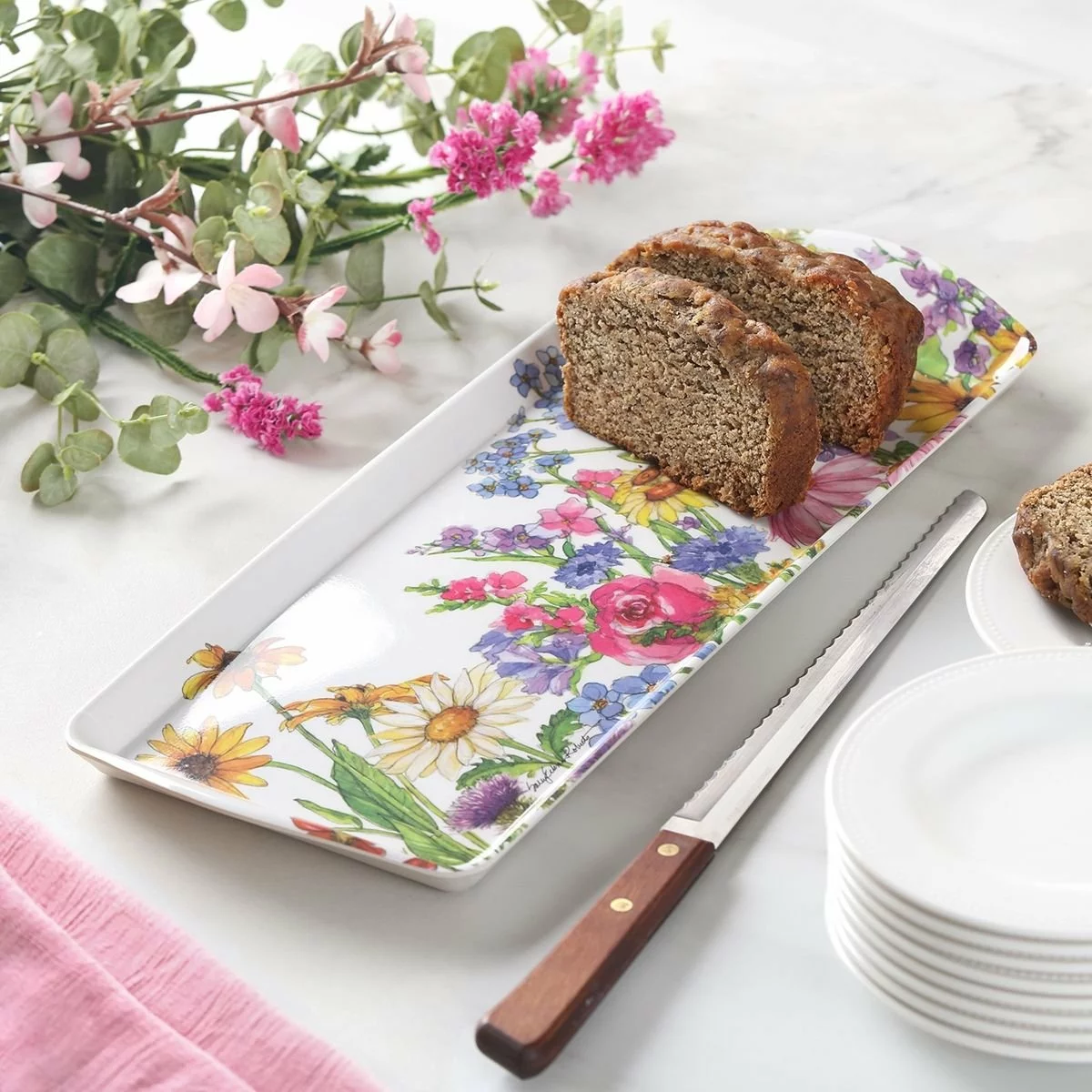 Celebrate the beauty of the natural world while doing your part to preserve it with the Wildflowers Loaf Tray from Bamboo Table! Designed by watercolor artist and company co-founder Sally Eckman Roberts, this tray features stunning yellows, delicate purples, vibrant greens and soothing blues so beautifully detailed that you can almost smell the fragrant summer meadow in which they grow. The perfect size for a loaf of fresh-baked banana bread bread, it makes an artful and practical backdrop for serving up all your favorite homemade goods. This tray is constructed from the by-products of bamboo furniture manufacturing that would otherwise be burned and released into the atmosphere. Bamboo also grows quickly, without the need for special irrigation, pesticides or other chemicals, thus reducing harmful deforestation and making these products an excellent eco-friendly choice. Though it shouldn’t be used in the microwave, this tray is shatter-resistant and dishwasher-safe for guaranteed durability and easy cleanup. For a uniquely beautiful serving dish that values nature in both form and function, order your Bamboo Table Wildflowers Loaf Tray today!