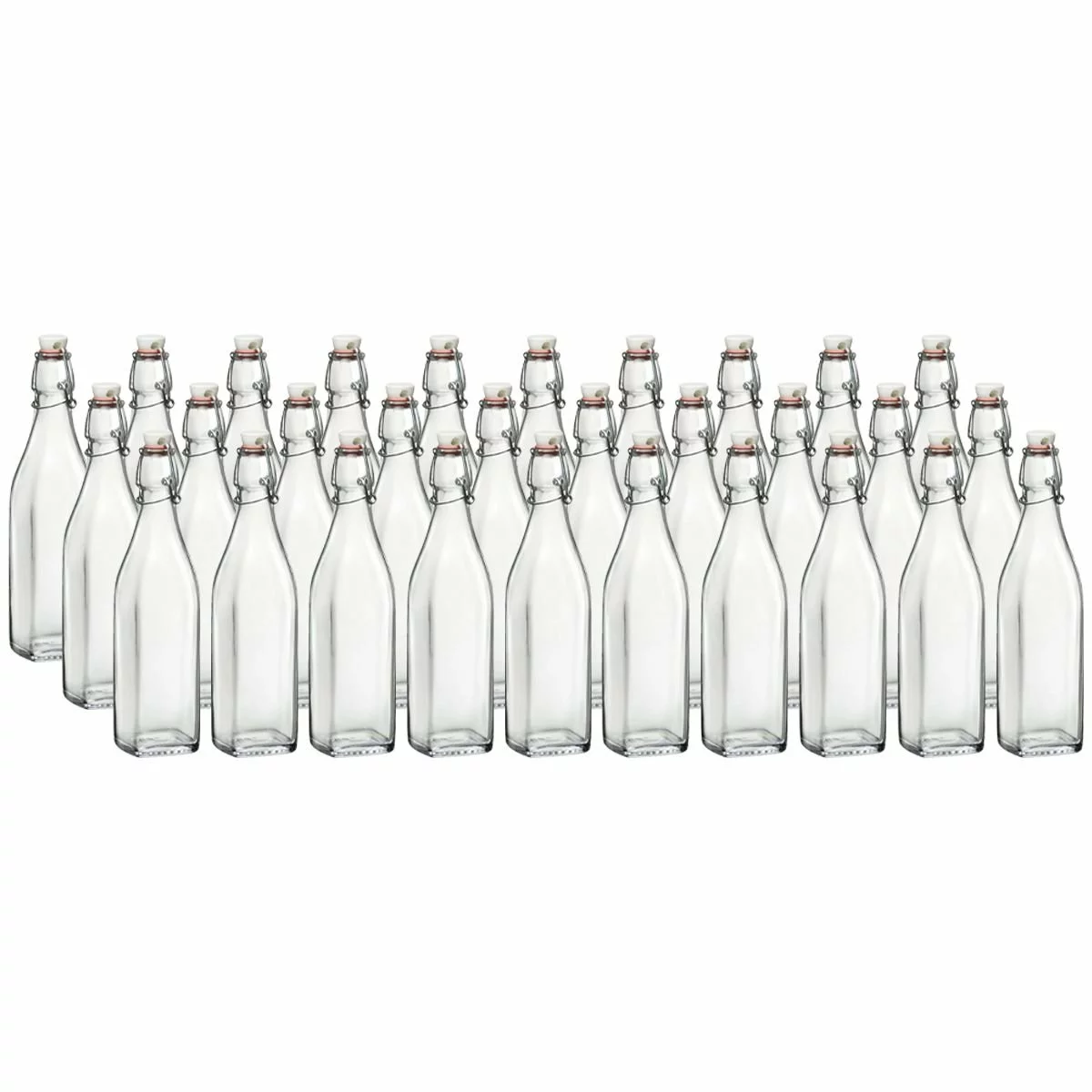 High-quality Italian glass and a classic design makes this 30-pack of Bormioli Rocco 17oz Swing Top Glass bottles a beautiful solution for storing or gifting your homemade infused vinegars, rich syrups, or flavored liqueurs. The hermetically sealing swing-top lid creates a leak-proof seal for storage or travel, and the sturdy glass construction makes the bottles both durable and practical. Bottles are dishwasher safe, but wire swing-top should be hand-washed.