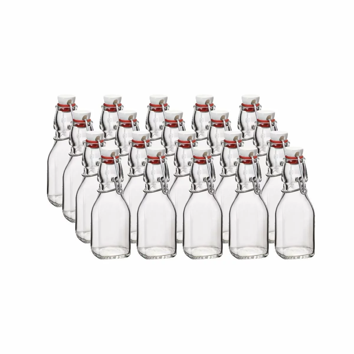 High-quality Italian glass and a classic design makes this 20-pack of Bormioli Rocco 4.25oz Swing Top Glass bottles a beautiful solution for your homemade wedding favors or gift baskets, or for simply storing your handcrafted infused vinegars, rich syrups, and flavored liqueurs. The hermetically sealing swing-top lid creates a leak-proof seal for storage or travel, and the sturdy glass construction makes the bottles both durable and practical. Bottles are dishwasher safe, but wire swing-top should be hand-washed.