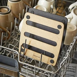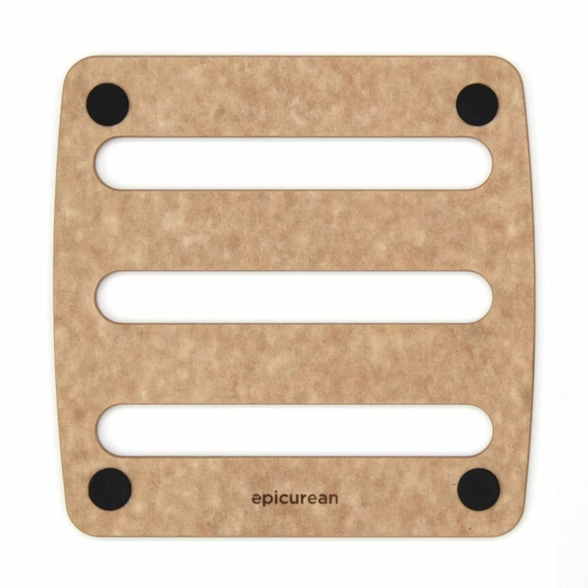 Protect your tables and countertops while stylishly serving your favorite dishes. The Epicurean 7″ x 7″ Trivet in Natural & Black is crafted from our signature wood composite and can withstand temperatures up to 350°F / 176°C. Silicone buttons run through the trivets to grip both the pan and countertop for safer serving. The vent design also allows excess heat and moisture to escape. The trivet is made with 3/16 inch material.