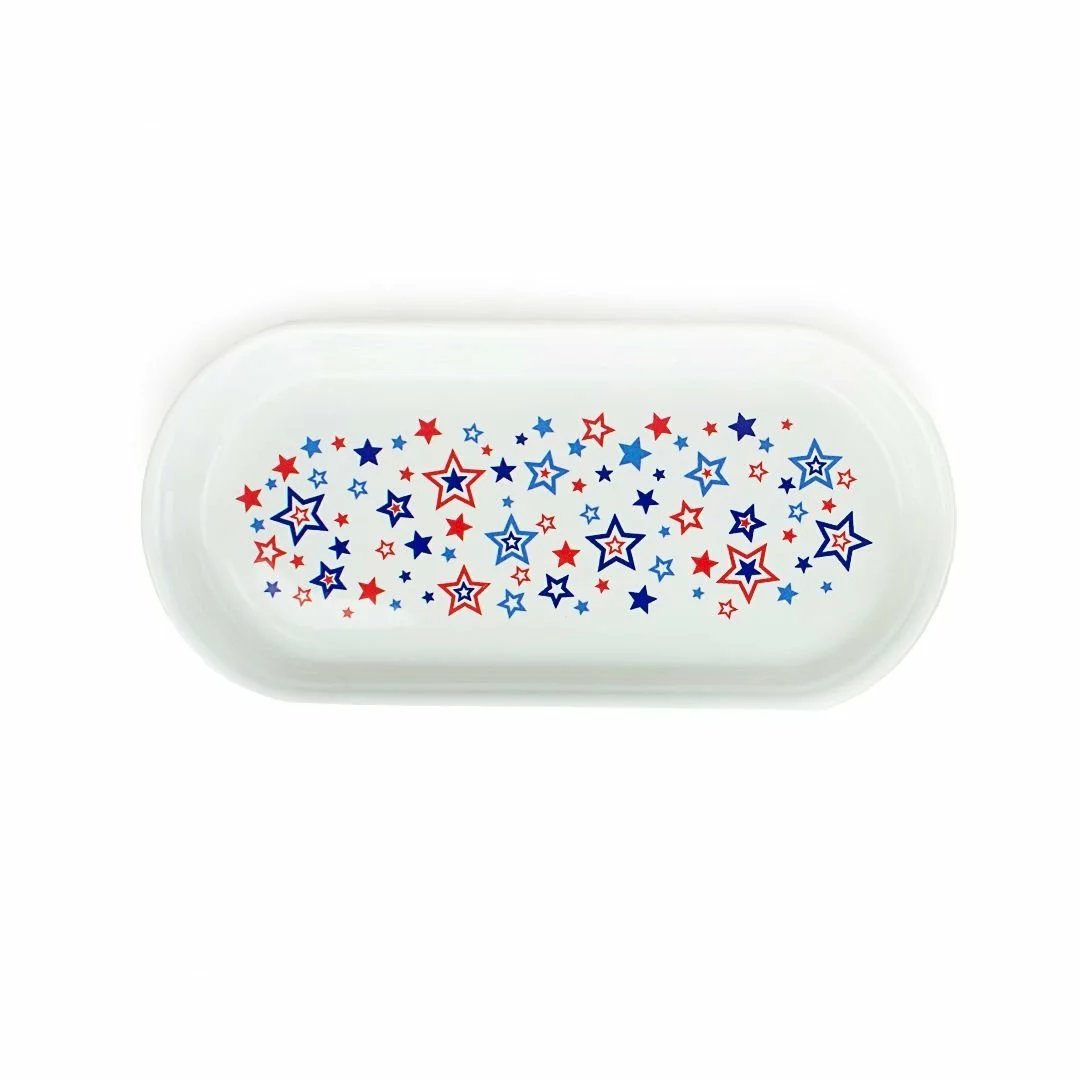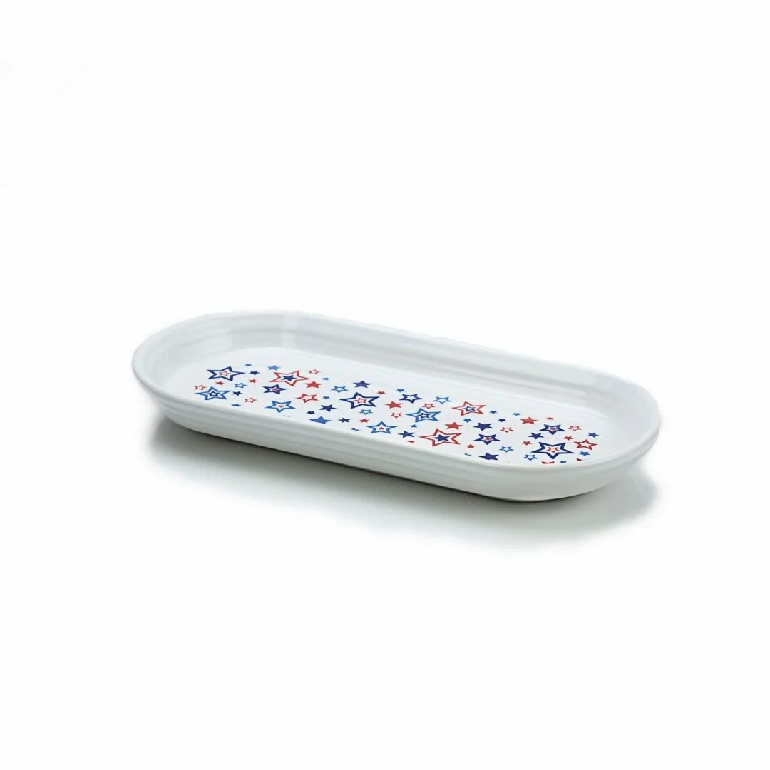 Like all Fiesta®, this tray is fully vitrified, industrially strong, and lead-free. It’s dishwasher, oven, and microwave safe, and since it comes with a 5-year chip-free warranty, it’ll be as beautiful years from now as it is today. With a length of 12-inches, it’s large enough to accommodate bread, rows of finger sandwiches, cookies, caramel apples, and other classics. Add this pretty tray to your Americana Stars Fiesta® collection, or if this is your first piece, combine it with white or any of the signature colors used in the pattern to create a beautiful, festive table!