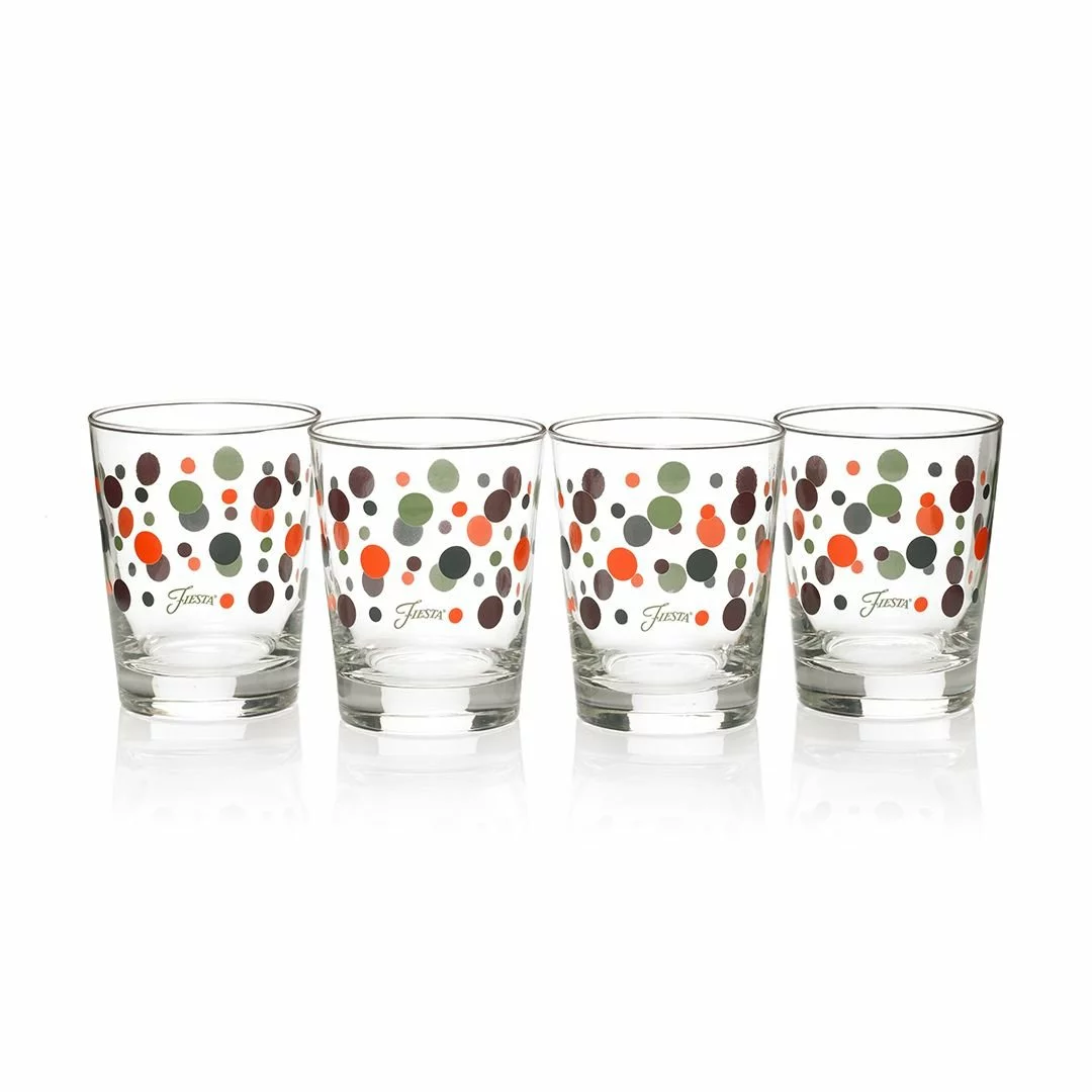 Serve your favorite beverages in fun and festive Fiesta® colors with the Double Old Fashioned Glass Set in Slate Fiesta® Dots! Crafted of lead-free high-quality glass and proudly made in the USA, these glasses have wide rims and thick bases for muddling ingredients, making them perfect for serving cocktails like a Whiskey Sour or an Old Fashioned. With Slate, Sage, Claret, and Poppy dots, these elegant glasses will look great with any of your grey, green, red, and orange Fiesta® pieces or as a colorful accent with your existing dinnerware. Add a pop of color to your dinnerware collection with the Fiesta® Double Old Fashioned Glass Set today!