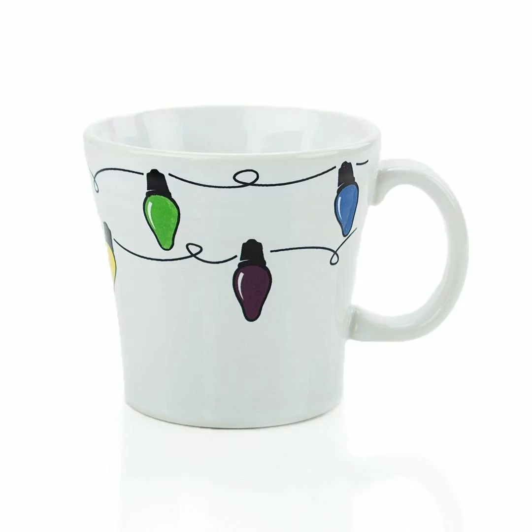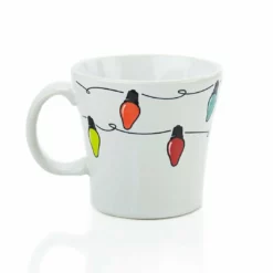 Celebrate the season with Fiesta® dinnerware! Holiday parties, Christmas dinner, and cold nights in front of the fire are all better enjoyed with the Fiesta® Lights collection by Fiesta®. This white 15oz Tapered Mug features a string of Christmas lights in a variety of your favorite Fiesta® colors: Scarlet, Daffodil, Mulberry, Poppy, Turquoise, Shamrock, Lapis, and Lemongrass. Complementing so many colors makes it easy to add a festive touch to your table while utilizing the dinnerware you already own! Like all other American-made Fiesta®, this mug is made of high-quality Homer Laughlin china and since it comes with a 5-year chip-free warranty, you can put it into daily use without worry. Use it for hot chocolate when you come in from the cold, bake a mug cake in the microwave, or enjoy your coffee every morning in your favorite festive mug!