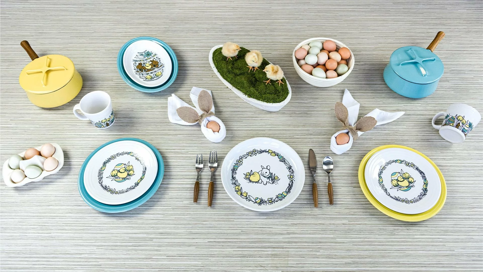 Spring is in the air – hear the birds chirping & breathe in the sweet aroma of blossoming flowers. The Everything Kitchens’ Exclusive Easter Enchantment collection by Fiesta® features curious baby chicks & fuzzy bunnies searching for hidden Easter eggs in fields of fresh flowers. The Fiesta® 15oz Tapered Mug Set includes four mugs that feature an inquisitive baby chick & bunny peering thru blooming flowers on their own little Easter egg hunt. The Turquoise & Sunflower pattern is on a traditional Fiesta® White Tapered Mug.