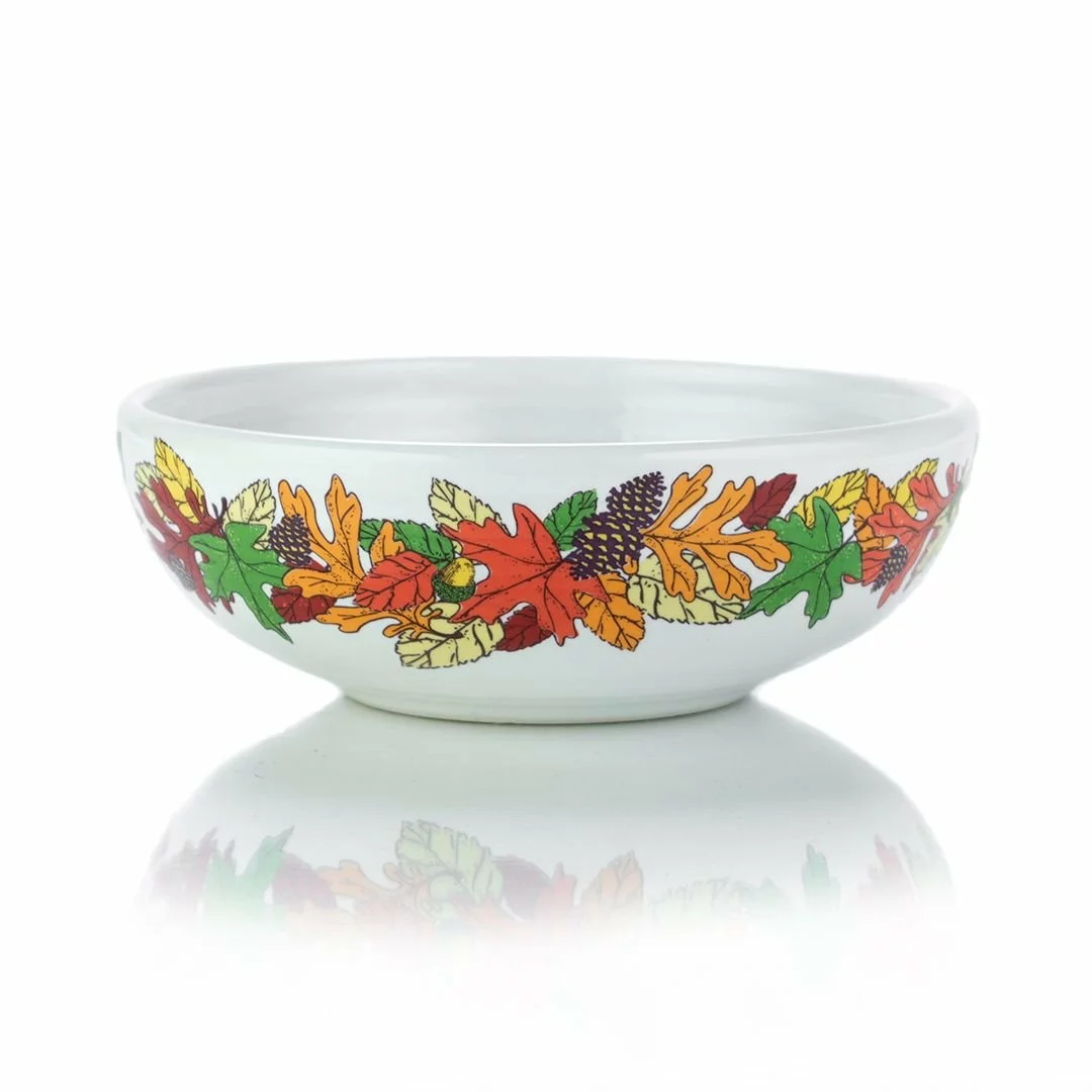 - Fiesta® white glaze featuring a festive acorn, pinecone, and leaf design