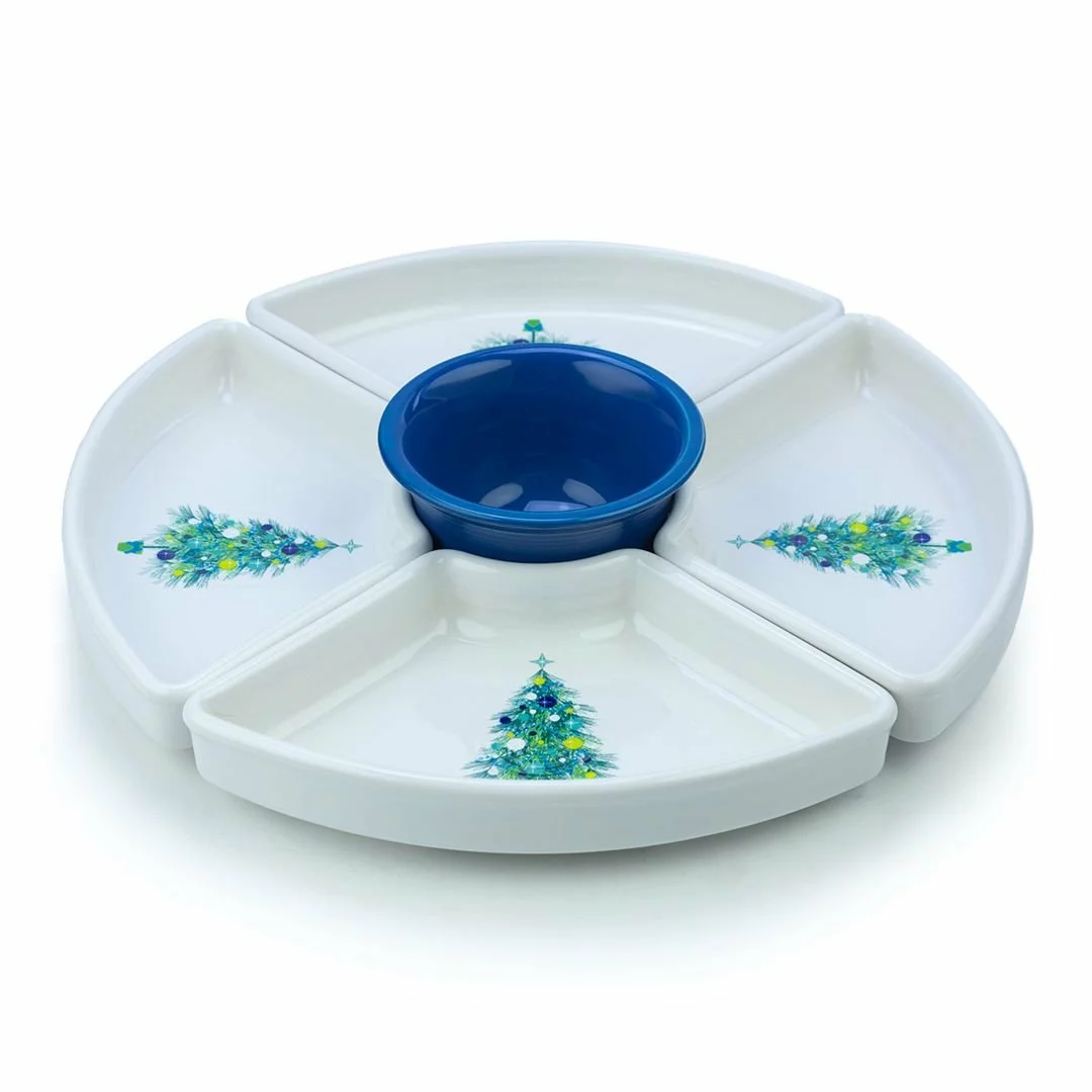 Spread Christmas cheer while your guests feast on delicious snacks and finger foods with Fiesta®’s Blue Christmas Tree 5-Piece Entertaining Set in White. This 12-inch set includes four White trays with Fiesta®’s signature Christmas Trees in the center that hold approximately 11oz of snacks each with a 6.75oz Lapis bowl to hold your favorite dip or salsa. Like all Fiesta®, this entertaining set is fully-vitrified, industrially strong, and lead-free. It’s safe for the dishwasher, microwave, oven, and freezer. And since it comes with a 5-year chip-free warranty, you can count on it being beautiful and ready for the party, year after year. Whether you fill the trays with veggies and the center with a creamy ranch dip, choose a variety of chips with salsa, or pile the trays with fruit skewers and go for a caramel or cream cheese dip, this 5-Piece Entertaining Set is sure to be the hit of any party!