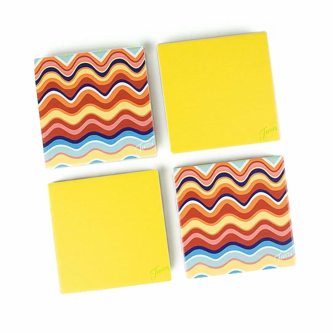 Enjoy your favorite ice-cold drinks this summer without sacrificing the lifespan of your hardwoods and get the Multi Wave Coaster Set from Fiesta®! The coasters feature two solid yellow, and two with a series of wave stripes in blue, white, red, orange, and yellow, which together give a definitively summer aesthetic. Made from gypsum stone, these coasters easily absorb the excess sweat from cold drinks and act as buffers between hot drinks and surfaces that may be damaged. The Fiesta® coasters measure 4.25″, so they will thoroughly protect your tables and counters from even larger cups or mugs. Mix and match these coaster sets from Fiesta® to decorate and protect your table in style! Get yours today and enjoy these beautifully printed coasters for years to come!