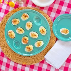 Present your deviled eggs in style with Fiesta®’s Deviled Egg Tray in Turquoise Blue. This 11” diameter vibrant deviled egg tray is made from thin vitrified china that is protected from cracking, chipping, and fading, and contains no lead. With 12 wells, this ceramic deviled egg tray is perfect for serving at a family gathering or luncheon and can easily be cleaned in the dishwasher after use. Bring color and taste to the party with Fiesta®’s Deviled Egg Tray in Turquoise Blue!