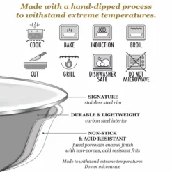 - Made from carbon steel coated in porcelain enamel with stainless steel trim