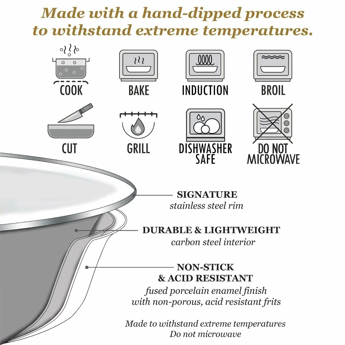 For over 30 years, Golden Rabbit has mastered the manufacturing process of enamelware. Using thick gauge steel and Belgium’s premium porcelain enamel, the finest materials go into every piece of enamelware. Handcrafted in Indonesia, each piece fuses enamels and steel at extremely high temperatures to produce quality workmanship. Whether traditional marbled enamelware or distinct patterns and designs, Golden Rabbit’s oven-to-table enamelware is unparalleled in quality and functionality.