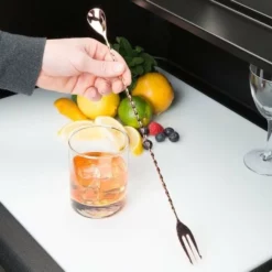 Show off your masterful mixology skills the next time it’s your turn to entertain by reaching for professional-quality bar tools from Barfly Mixology Gear by Mercer. With the Barfly 15.75” Copper-Plated Stainless Steel Bar Spoon with Fork M37016CP, you’ll show a deft hand at properly mixing pitchers of sangrias, mojitos, mint juleps, or spiked lemonades and punches for your cocktail-loving friends. Barfly’s fetching Copper-plated bar spoon is formed from a single piece of durable stainless steel that won’t absorb stains or odors that could cloud the taste of fine spirits. This dual-use bar tool has a spoon on one end and a fork on the other. The spoon is precision-molded for accurate measuring, precise pouring, and gentle stirring; the fork end is designed with long tines, two of which are barbed, to securely spear fragile garnishes like fresh and candied fruit, olives, and onions. The elegant spiraled handle is designed with a twist to gently mix ingredients without bruising, and at a statuesque 15.75” long, it’s perfect for tall drink glasses and pitchers. With such alluring looks and expert performance, Barfly Mixology Gear by Mercer can turn your kitchen into the neighborhood’s trendiest cocktail lounge.