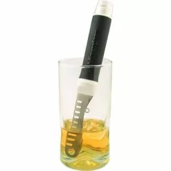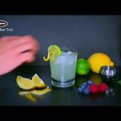 The cleverly designed, upper portion of the tool, which is durably constructed in stainless steel, offers 6 built-in beverage-making features. The dual-purpose clear protective cover is serrated at the tip to mash and blend ingredients, such as fresh mint leaves, sugar and lime juice for authentic mojitos. At the top end, a middle hole is purposely designed to facilitate stirring to help combine ingredients, chill and dilute for perfectly balanced drinks. Next to the stirrer is a small, sharp knife blade to conveniently trim herbs, slice citrus fruit paper-thin, and prep other ingredients. Below the knife blade, the Ultimate Bar Tool includes a razor-sharp scorer to pierce through the tough skin of limes, lemons and other citrus fruits before peeling. Below the knife blade and scorer is an equally sharp channel knife (twist tool) to transform citrus peel into elegant garnishing twists. A well-designed integrated strainer that fits across both a standard size tumbler and a shaker, and helps prevent muddled bits of fruit or ice from falling into serving glasses, is located on the opposite side of the tool.