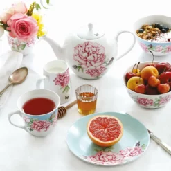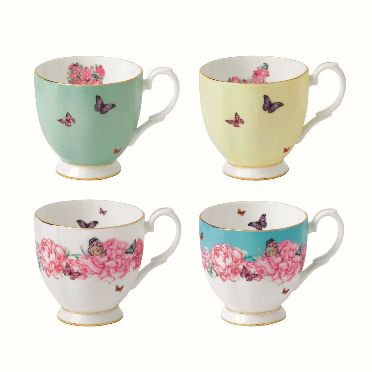 Delightful and nostalgic, the Miranda Kerr for Royal Albert 10.5oz Mugs Set will add a dash of elegance when entertaining and enjoying coffee or tea! Inspired by model & business woman Miranda Kerr’s childhood memories of drinking tea out of her grandmother’s Royal Albert collection, the Miranda Kerr for Royal Albert Friendship Collection blends classic vintage details with contemporary style for beautiful and inspirational pieces. This set includes four mugs crafted from fine bone china and adorned with delicate peonies and fluttering butterflies. With gold banding along the base and rim, this mug set will help create a romantic and traditional table setting that’ll add that extra-special touch for both casual tea time and special occasions. Packaged in a beautiful Royal Albert box, the Miranda Kerr for Royal Albert 10.5oz. Mugs Set will become a cherished set you’ll love pulling out to enjoy with friends & family!