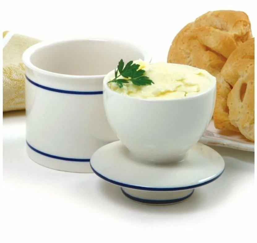 Always have soft, spreadable butter at the ready with Norpro’s Butter Keeper. Holding up to 1 stick of butter, this glazed stoneware crock allows you to keep butter out on your counter or table for up to 30 days, with no refrigeration! To use, simply pour approximately 1/2” of water into the base, fill the top of the butter keeper with butter, and turn it upside down into the base. The water creates a seal to lock out air, so your butter stays fresh and ready-to-use for up to a month. Keep butter in Norpro’s Butter Crock and you’ll always have perfectly spreadable butter for your morning toast, baked potatoes, and dinner rolls.