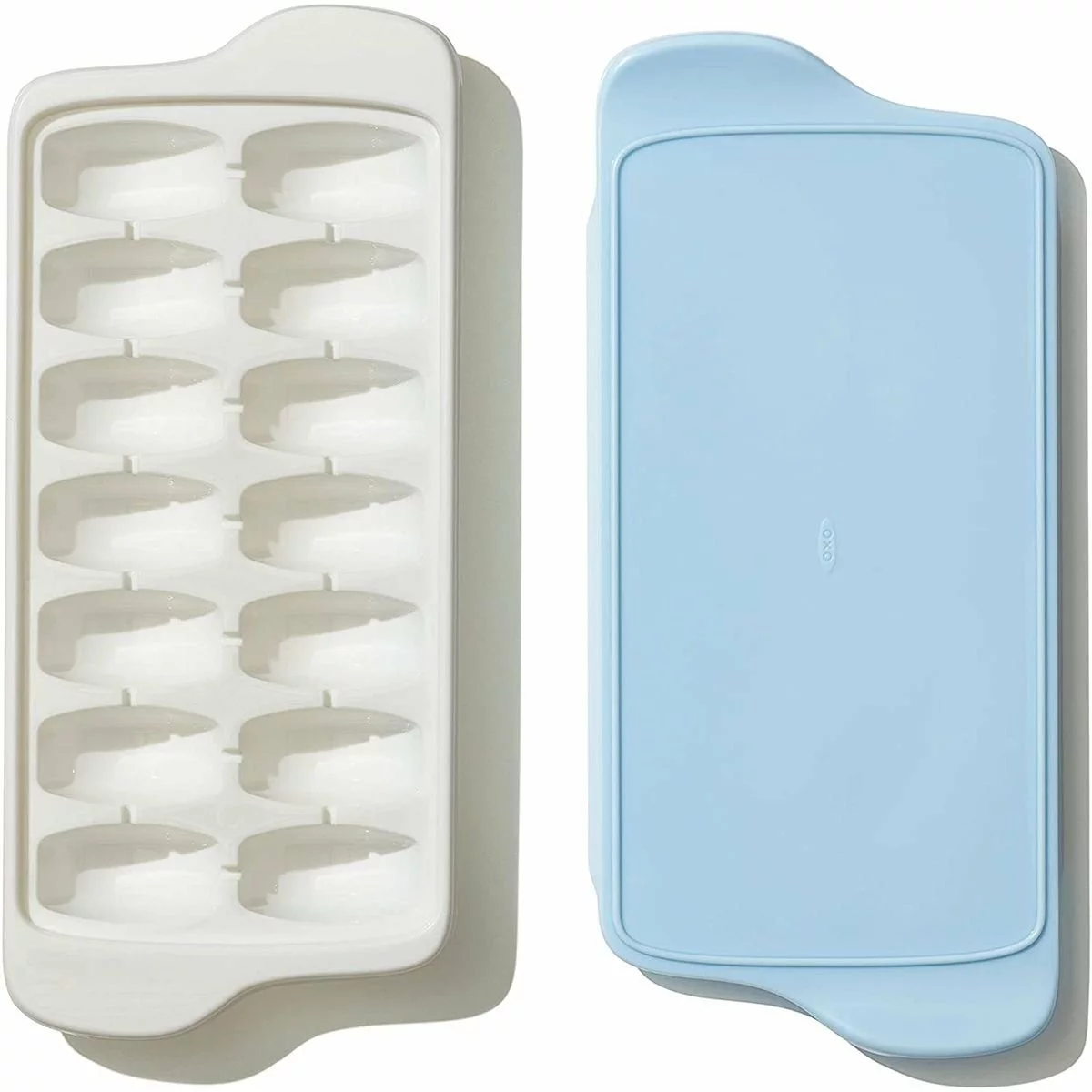 Keep freezer odors from permeating your ice cubes with the OXO Good Grips Covered Ice Cube Tray! The patented BPA-free lid slides on/off when filling the tray and keeps the rest of the tray contained when you only want to remove a few ice cubes. The covered tray also allows you to stack items on top of the trays even when freshly filled with water, so you get the most out of your freezer space. Removing ice cubes is quick and easy thanks to the rounded easy-release design of the ice cube wells!