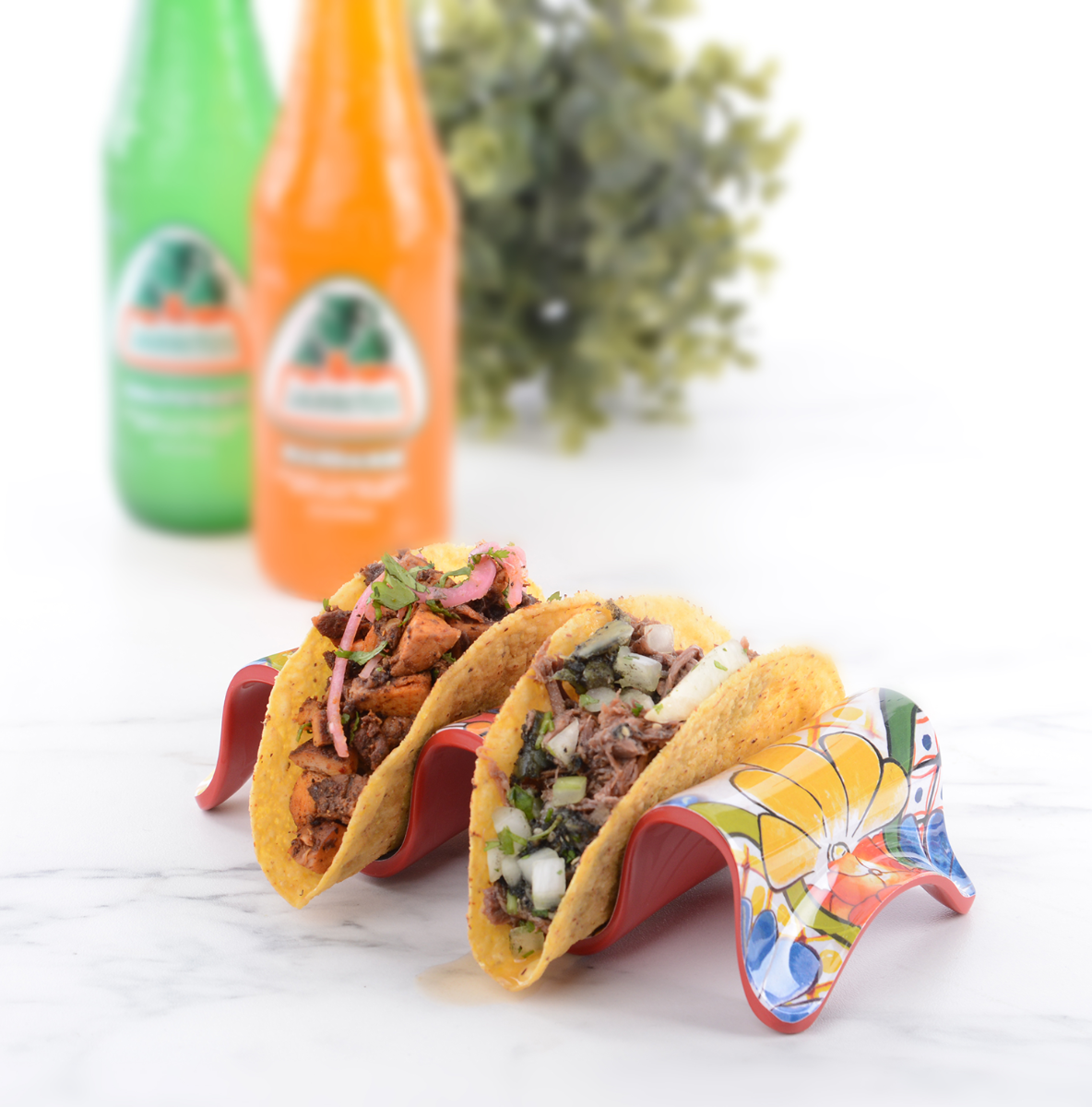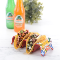 With the Prepara Multi-Taco Holder, filling & enjoying your favorite tacos has never been easier (or cleaner)! This handy holder keeps hard or soft taco shells upright and ready to layer with sour cream, meats, cheese, salsa, guacamole, and other delicious toppings. Once you’ve filled your tacos, easily enjoy them throughout your meal without worry of them spilling or falling apart – the taco holder will keep them sitting upright so contents stay in the taco and off the table. This taco holder is made of BPA-free melamine and features a beautiful glossy design that’s crafted to look like ceramic for a durable & lovely piece that’ll add a fun fiesta touch to taco night! The reversible design can be used for holding two or three tacos at a time and is the perfect addition for build-your-own taco parties, taco Tuesdays, and more!