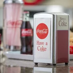 Capture that nostalgic feeling and bring a piece of vintage diner and soda shop decor right into your kitchen, rec room, or bar with the Coca-Cola Full Size Napkin Dispenser from TableCraft! Metal housing features classic Coca-Cola branding and a spring-loaded dispenser that holds 100 tall-fold paper napkins and pairs perfectly with the TableCraft “Have a Coke” Napkins. Add a retro touch to your home or workspace with this restaurant style napkin holder featuring one of America’s most iconic brands!