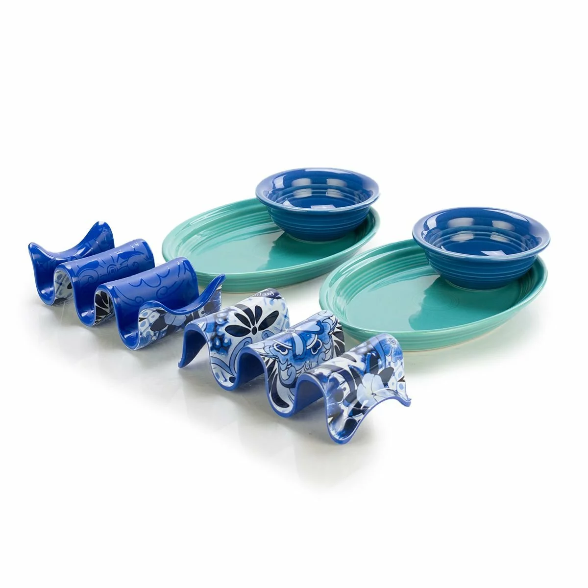 Host your friends and family for a taco night with this fantastic six-piece set of dishes from Fiesta® and Prepara! Including two of each: Prepara Multi-Taco Holders in Blue, a Fiesta® 9.6″ Small Oval Serving Platters in Turquoise, as well as Fiesta® 9oz Fruit/Salsa Bowls in Lapis, this set has everything you need for taco fun!
