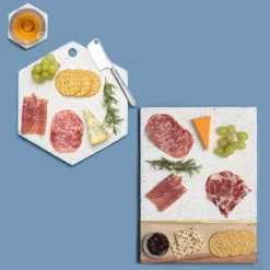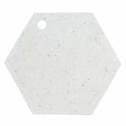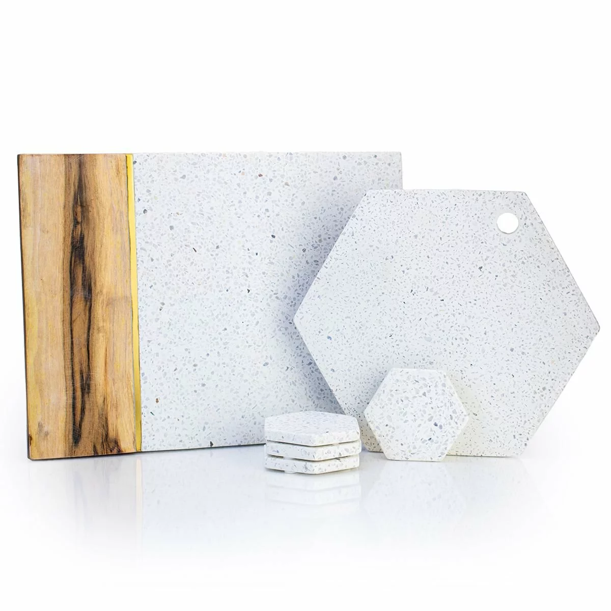 Create a dazzling presentation at your next dinner party with the Typhoon Elements Collection Set! The Elements Collection features serveware that combines natural materials with unique textures and brass accents for an organic & stylish look. This set includes an eye-catching terrazzo stone hexagon serving board, a rectangular terrazzo stone & acacia wood serving board, & a set of 4 terrazzo stone hexagon coasters. The two included boards are great for serving a decadent charcuterie spread or bite-sized appetizers & desserts and will look great when displayed with the included coasters to match. Create a modern and chic table setting at your next wine night, weekly dinner, or special occasion with the Typhoon Elements Collection Set!